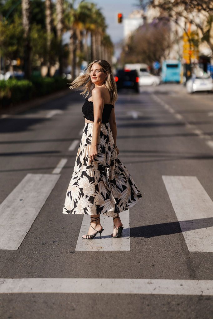Un top negro combina a la perfección con esta falda midi de vuelo, donde las flores en beige y negro crean un estampado atemporal que enamoran. Cada movimiento de la falda aporta ligereza y vida, convirtiendo este conjunto en una oda al romanticismo sereno y a la feminidad más natural.