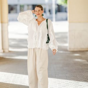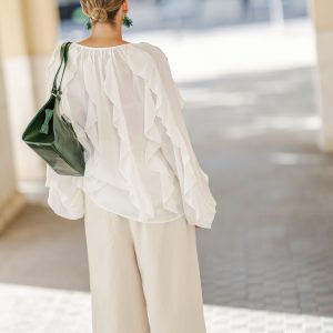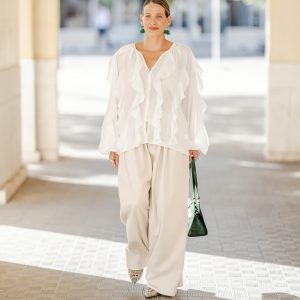 La camisa Aurora blanca está confeccionada en un tejido fluido y luminoso que aporta movimiento y delicadeza. 100% poliéster. Sus volantes verticales en frontal estilizan la figura, mientras que los horizontales en las mangas le añaden un aire romántico y femenino. Se abrocha con botones en la parte delantera, un detalle clásico que equilibra la fuerza de su diseño. Una pieza versátil y distinguida que se convierte en la protagonista de cualquier estilismo.