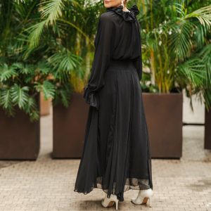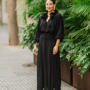 Blusa ligera y fluida en color negro, confeccionada en un tejido semitransparente que aporta elegancia y movimiento. El diseño destaca por su cuello adornado con volantes amplios que enmarcan el escote y aporta un toque sofisticado y femenino. Se ajusta ajusta con un lazo fino en la parte delantera, permitiendo llevarla abierta o cerrada según el estilo que quieras crear. De manga larga y corte suelto, los puños se ajustan con lazo fino. Es una prenda versátil que combina tanto con pantalones de vestir como con faldas o jeans.