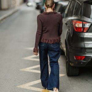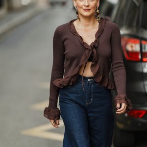 Chaqueta de punto fino chocolate con volantes de gasa.