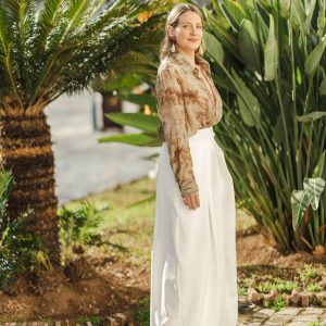 Pantalón ancho blanco estructurado. Las pinzas frontales estilizan la silueta y aportan un acabado más cuidado al diseño. Cierre interior con botón y doble cierre en pieza exterior. Bolsillos laterales y una pernera amplia que equilibra elegancia y comodidad.