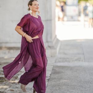 Pantalón ancho en tencel de color granate, con cintura elástica completa que se adapta con comodidad a la silueta y forro interior. Su corte fluido aporta movimiento y elegancia, mientras que el tejido ligero y suave potencia la caída natural. Una pieza versátil y sofisticada, perfecta para combinar con el top a juego o lucir en solitario en looks llenos de personalidad.