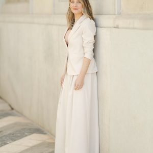 Pantalón de traje confeccionado en tejido ligero y fluido, con un delicado diseño de rayas sutiles que aporta elegancia y continuidad al conjunto. Su caída amplia y recta estiliza la figura, mientras que la cintura elástica en la parte trasera garantiza comodidad y un ajuste favorecedor. Bolsillos laterales.