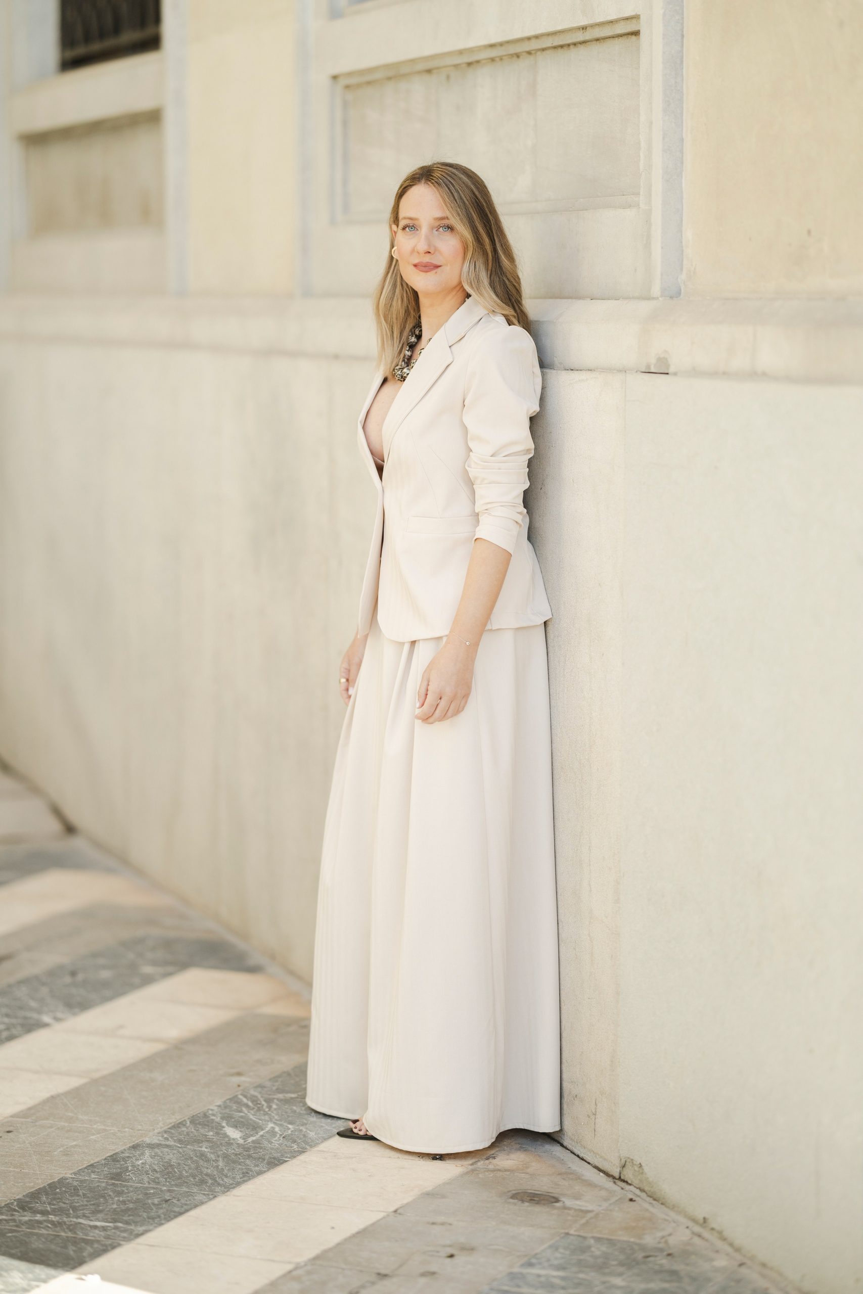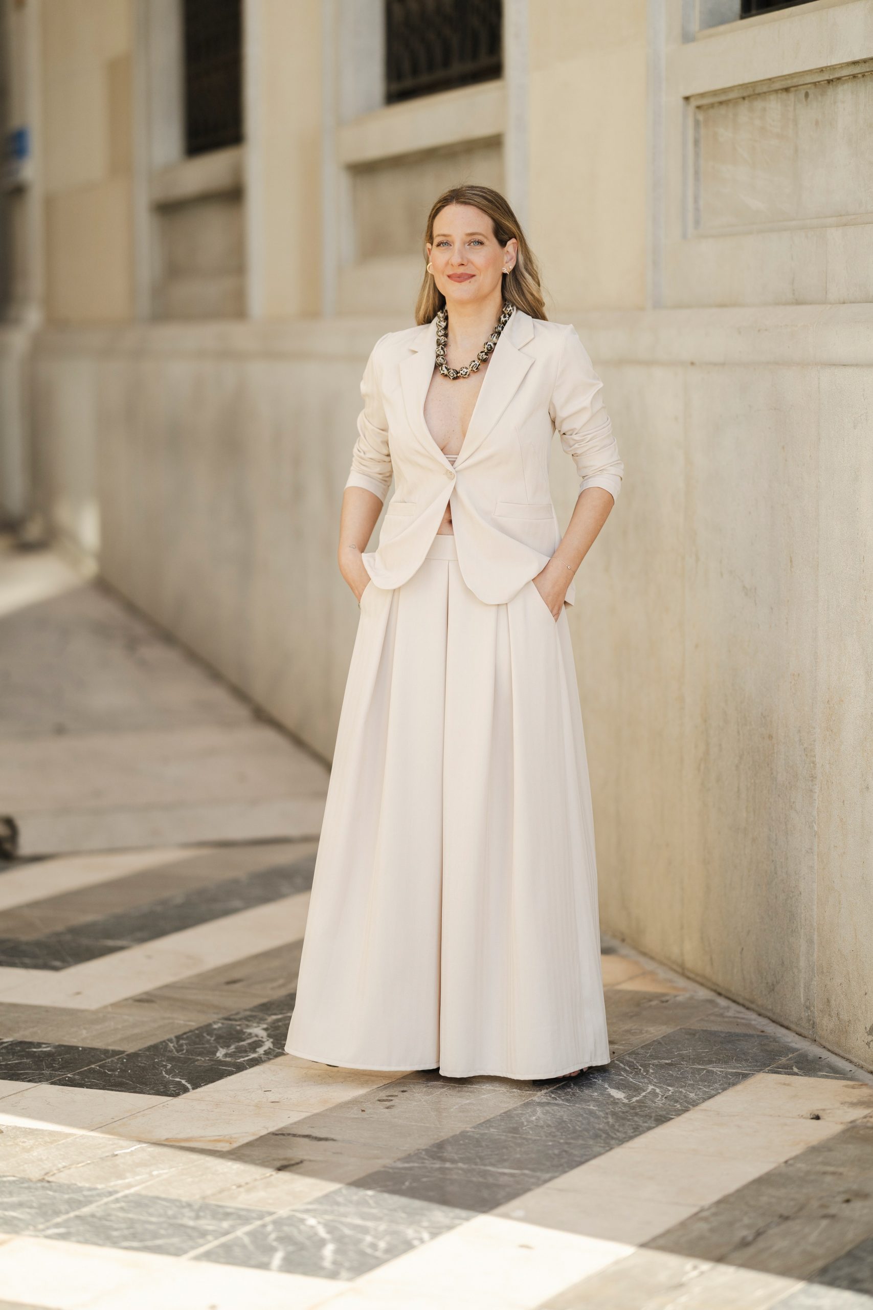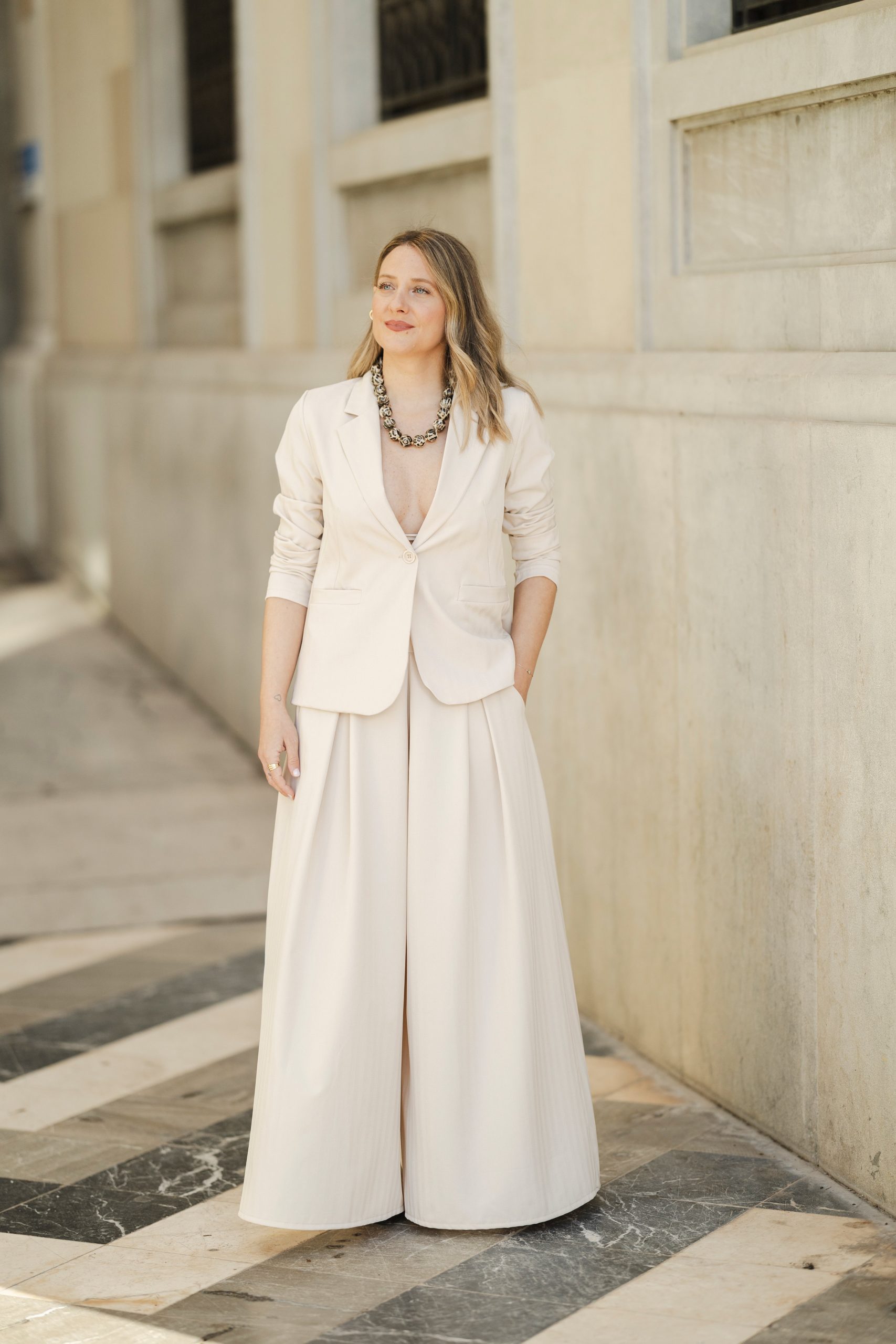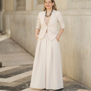 Una prenda versátil y atemporal, ideal para llevar en conjunto con la blazer, o combinar por separado en looks más relajados.
