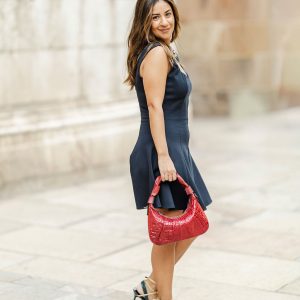 Vestido de punto corto azul marino con escote en pico y tirantes anchos que realzan los hombros. El corte estiliza la zona del pecho y la caída se abre con un vuelo que aporta movimiento sin perder elegancia. Es una pieza versátil que funciona tanto para un look de día como para una noche especial.
